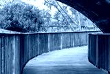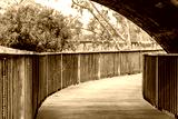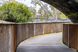 Walkway with wooden railings along the Merri Creek Trail, passes under a bridge near the weir at Coburg Lake Reserve in Melbourne, Australia.