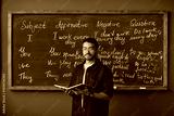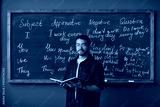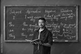 Portrait of young adult Black man standing in front of chalkboard holding open book, teaching English grammar lesson in language school classroom, looking directly at camera