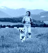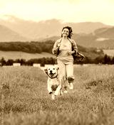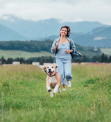 Happy smiling beagle dog running portrait tongue out with female owner jogging along mountain meadow grass path outdoor walking nature pets healthy active people lifestyle concept image