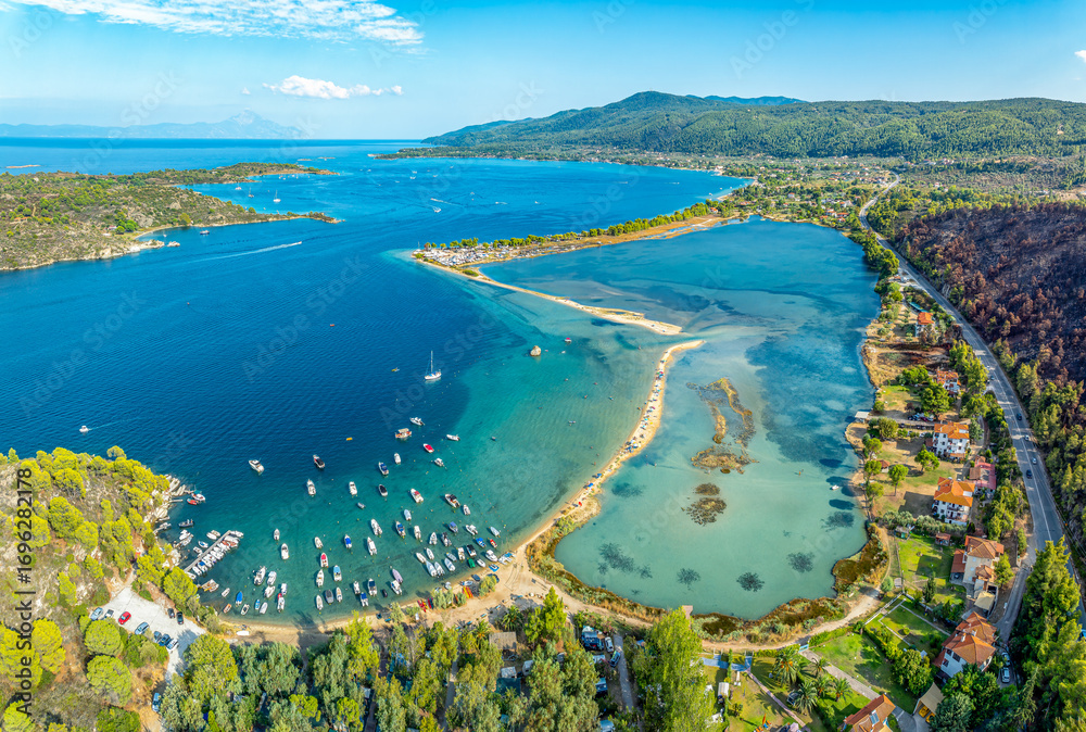 Aerial view of Livari Beach, Sithonia peninsula, Halkidiki, Greece.