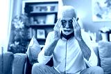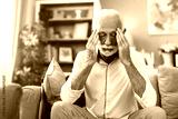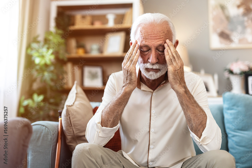 Stress, headache and senior man in home with worrying, overthinking or mental health. Anxiety, mistake and elderly male person with migraine in living room for regret, vertigo or brain fog in house.