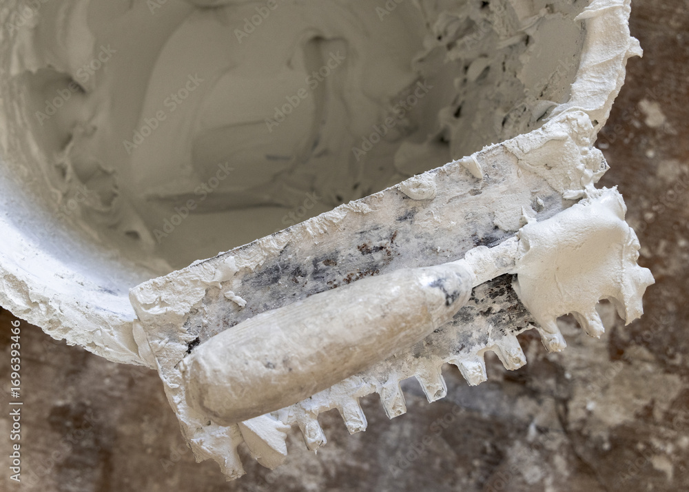 Bucket with plaster, notched trowel placed on side, covered in plaster residue, top view