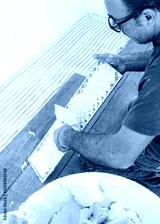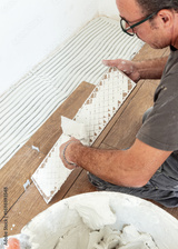 Craftsman spreads tile adhesive with notched trowel on a tile back, closeup. Construction process