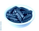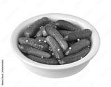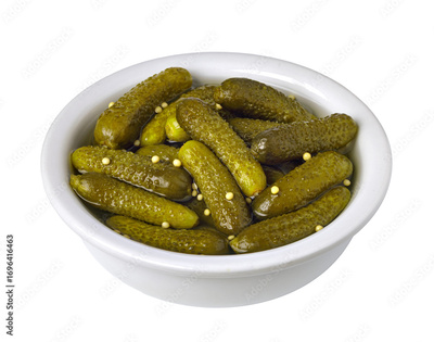Bowl of gherkins pickled in vinegar with mustard seeds on transparent background