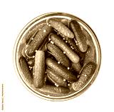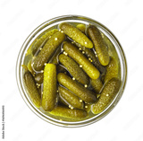 Glass bowl full of gherkins pickled with mustard seeds on transparent background