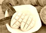 Mangoes cooked on wooden floor.