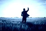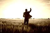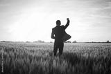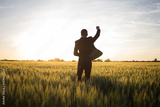 Happy buisinesman having fun in summer fields, man in buisines suit enjoy of freedom, concept of winner manager.