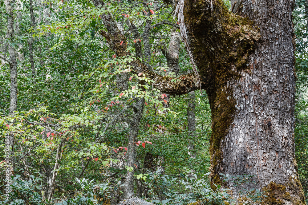 Tronco de roble melojo, rebollo y vegetación en el bosque. Quercus pyrenaica. Parque Natural del Lago de Sanabria y alrededores.