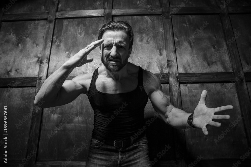 Under a dim light, a muscular man showcases his raw emotions, combining strength with tenderness as he passionately conveys his feelings in a rustic setting, highlighting an unexpected romance.