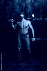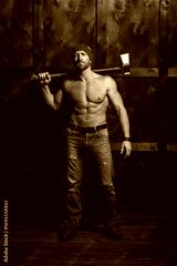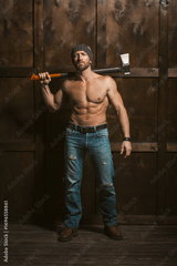 In a rustic setting, a muscular man stands confidently against a weathered wooden wall, holding an ax.
