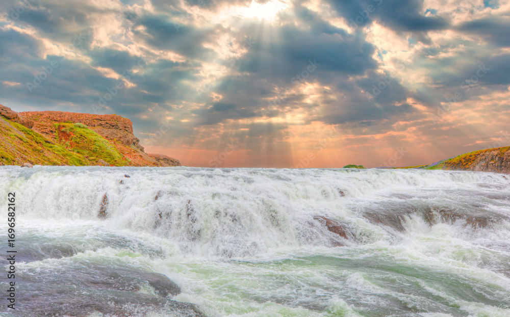 Panoramic view of Gullfoss waterfall on the Hvíta river, a popular tourist attraction and part of the Golden Circle Tourist Route in Southwest Iceland