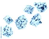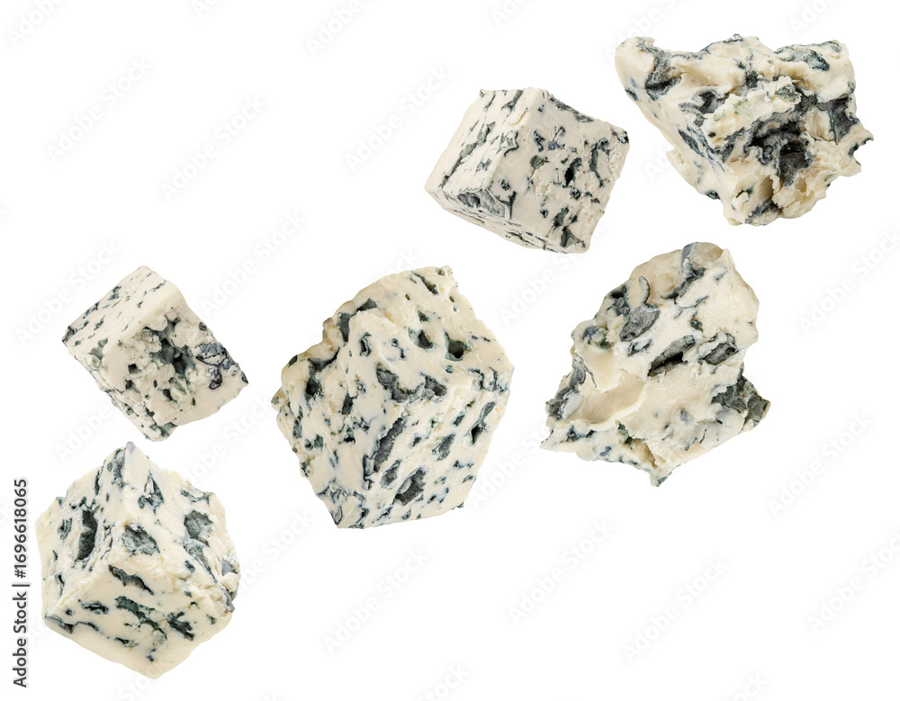 Flying Blue Cheese pieces isolated on white. HighQuality Levitating Blue cheese slices. Mold Cheese Explosion. Top view. Flat lay.