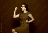Excited beautiful young woman with closed eyes and clenched fists, isolated on red background. Yes concept. Good news.