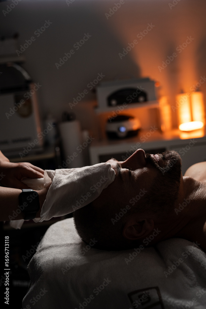 A man is lying on a massage table covered with a towel while receiving a facial spa treatment. A professional is gently applying a towel or compress to his face. The atmosphere is calm and relaxing