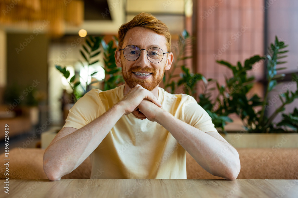 Casual man in glasses posing at table in bright restaurant waiting his order