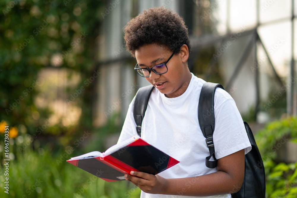 African american boy in eyeglasses with a book in hands looking involved and focused