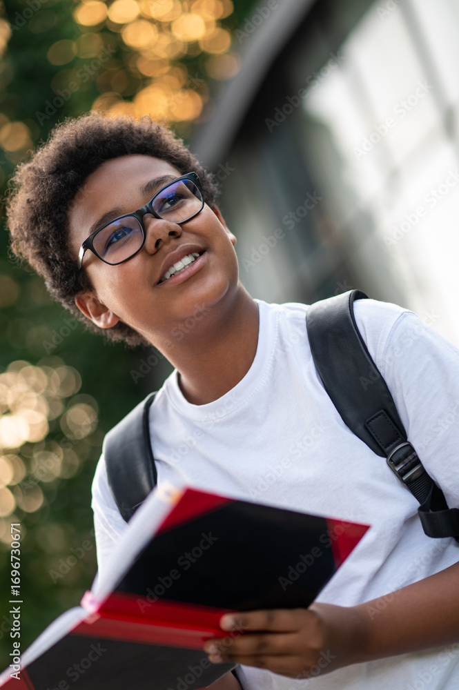 African american boy in eyeglasses with a book in hands looking involved and focused