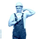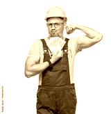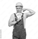 Portrait of young construction worker holds money, isolated on white background. Concept of dollars and banking. Studio shot