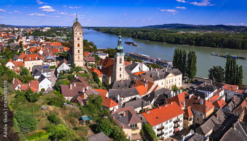 Austria tourism. Danube river boat cruise. scenic landmarks and beautiful villages - charming Krems town in Wachau valley, aerial drone view