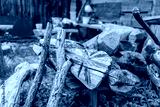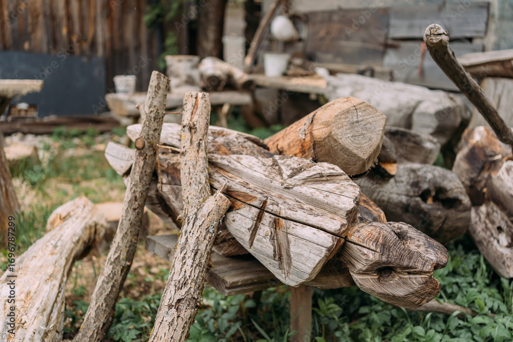 Close-up of rustic firewood and branches stacked near an old wooden workshop