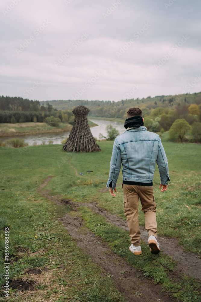 Man walking on grassy hill toward woven twig sculpture by a winding river under overcast sky