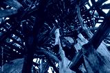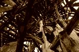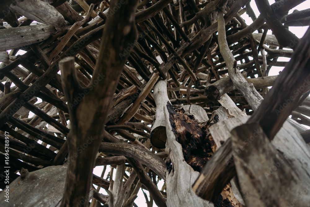Inside view of intertwined wooden branches forming a rustic sculpture, highlighting organic textures and structure