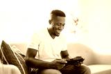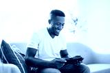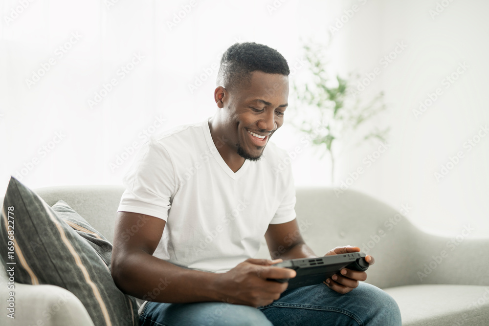 Playing video game. Young black handsome man sitting on sofa holding Handheld console in living room.