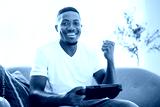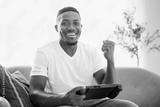 Playing video game. Young black handsome man sitting on sofa holding Handheld console in living room.