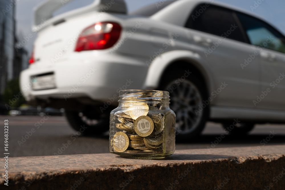 Glass jar with 100 Kazakhstani tenge coins and a passing car