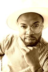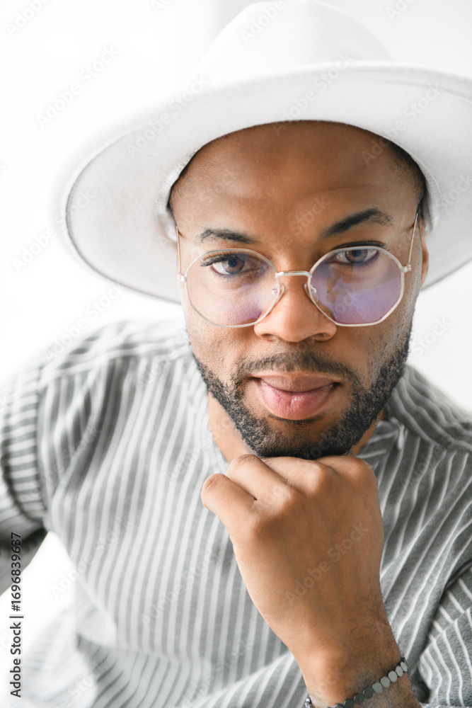Portrait of black fashion American wearing great looking clothes with white hat