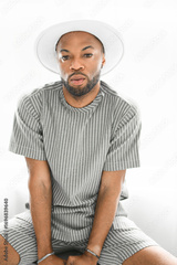 Portrait of black fashion American wearing great looking clothes with white hat