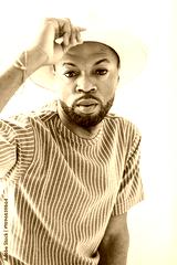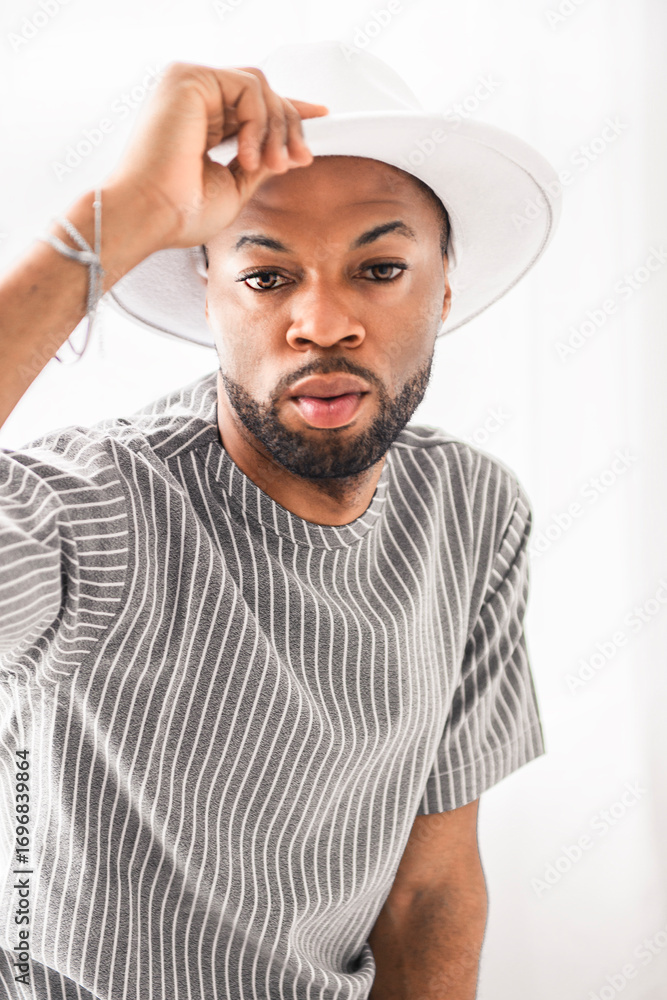 Portrait of black fashion American wearing great looking clothes with white hat