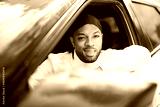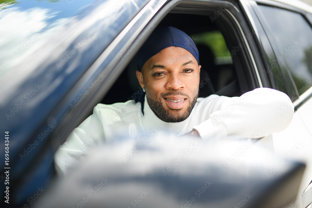 portrait of happy black american man driving car