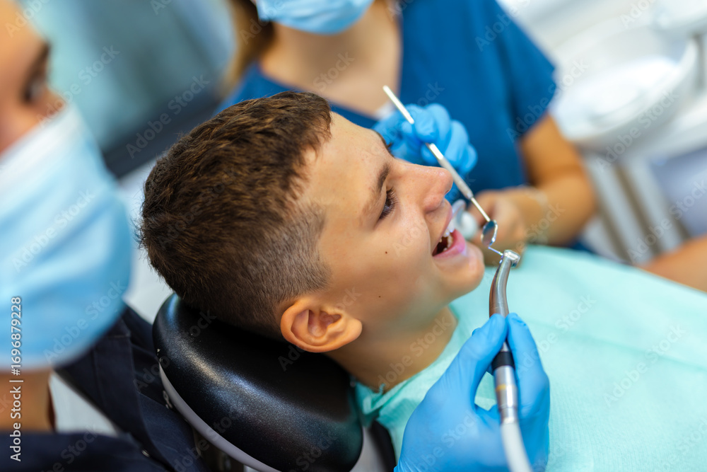 Two Dentists Repairing Boy’s Teeth in Modern Dental Clinic