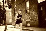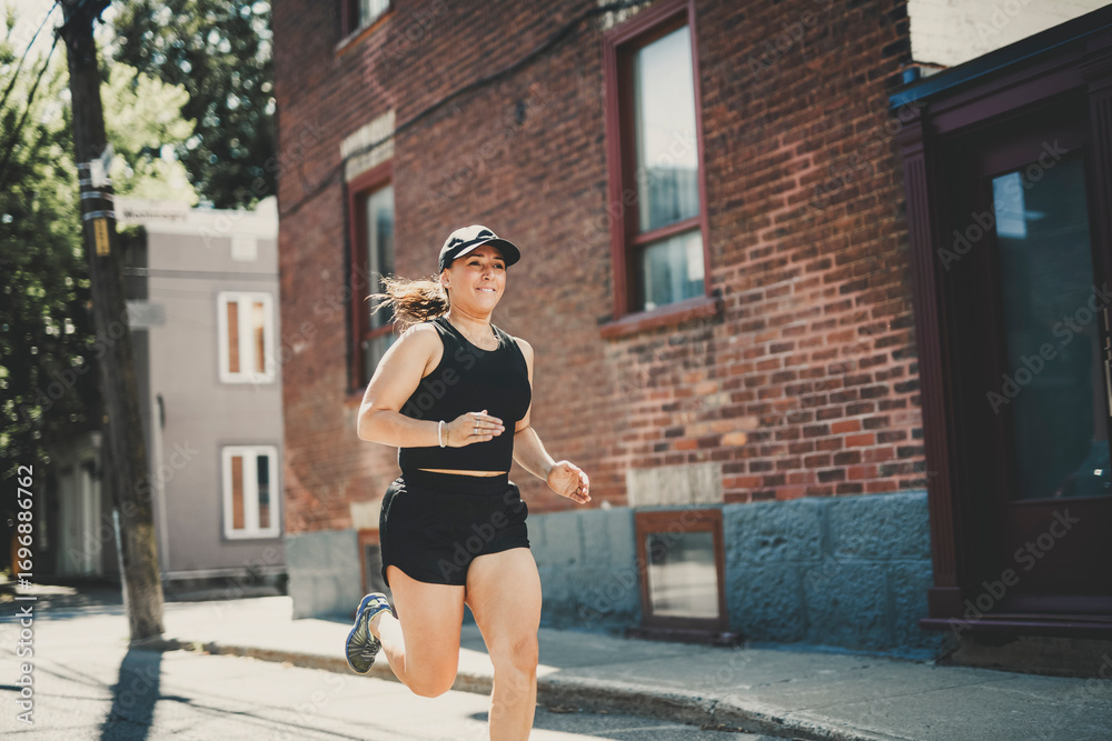 woman running outdoors, middle aged woman in sportswear.