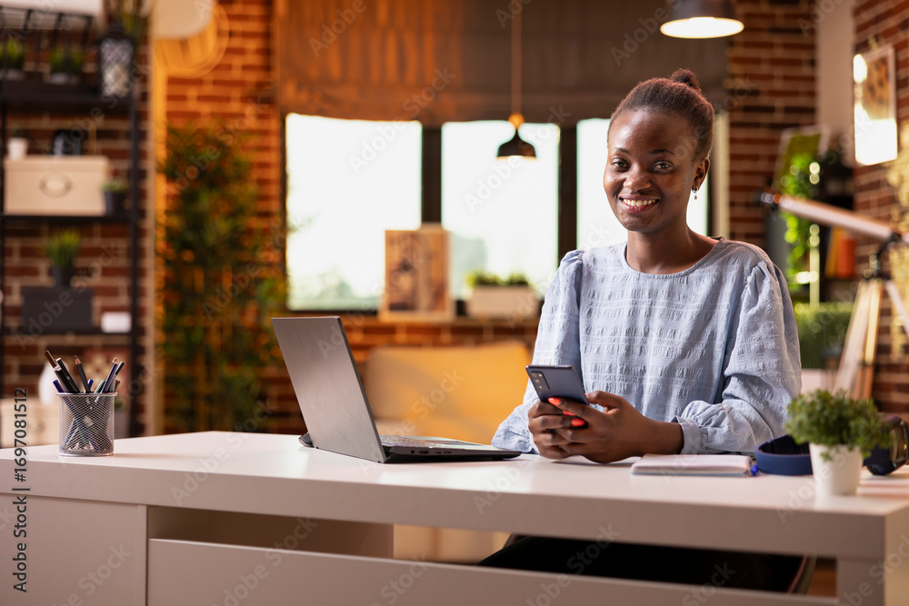 Joyful black female entrepreneur uses smartphone while working on laptop. Young woman balances remote work and digital networking at home, seated at desk waiting for phone call.