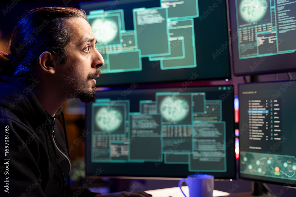 Cybercriminal using malicious script to compromise devices and digital networks, gaining passwords. Black hat hacker stealing, exploiting and illegally selling data online