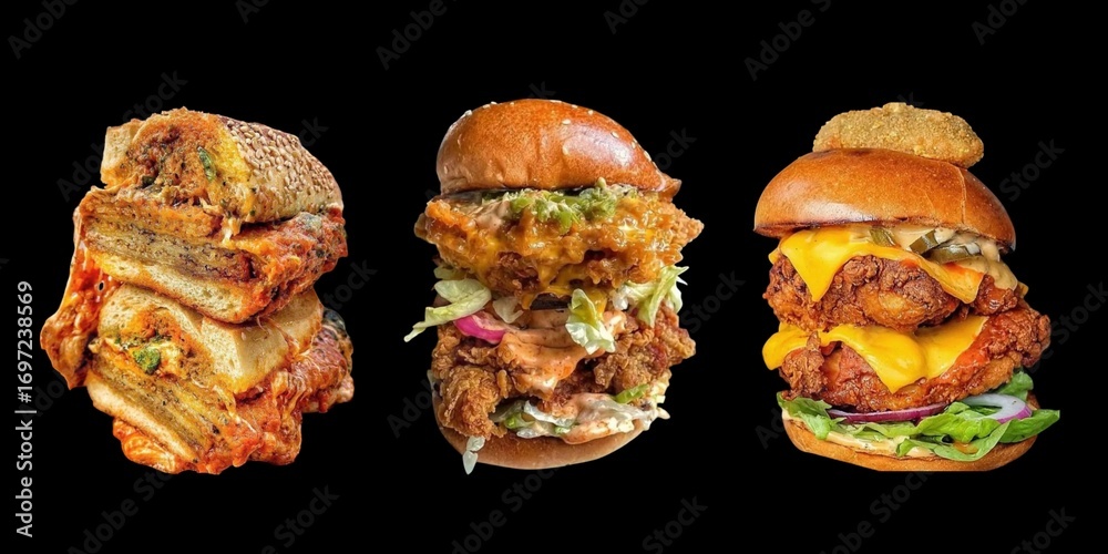 A collection of various burgers and fried chicken sandwiches on a black background.