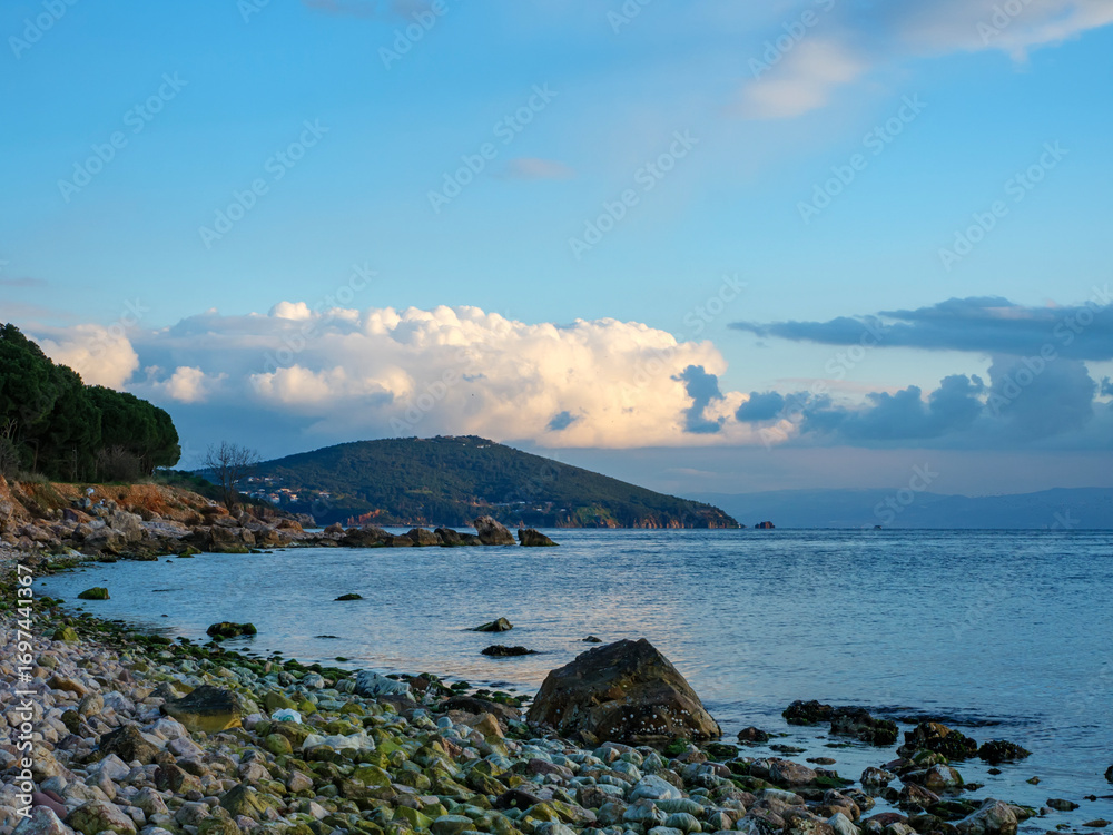 A serene view of a calm sea with a rocky coastline and distant islands under a soft cloudy sky a tranquil and picturesque natural landscape