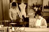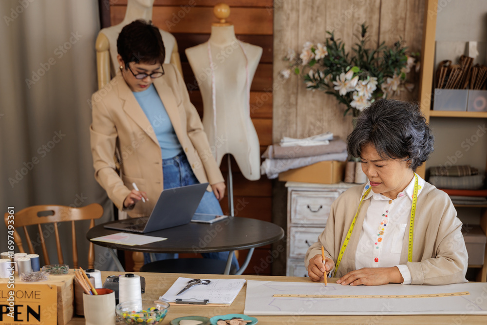 two Asian women working in their clothing design studio.