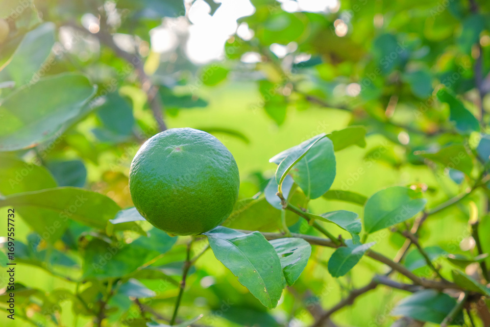 A lime hangs from a branch of a lemon tree, surrounded by healthy green leaves