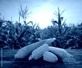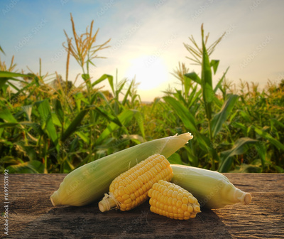 Fresh ripe yellow sweet corn on the cob with green husks growing in a field