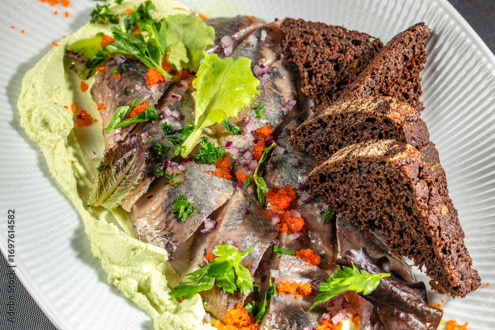 Marinated herring with rye bread, herbs, and red onion on a white plate