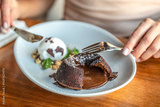Chocolate lava cake with vanilla ice cream and nuts on a white plate