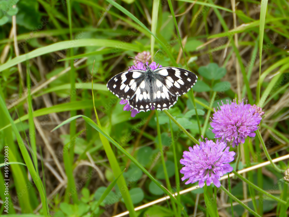 A chessboard butterfly (Melanargia galathea) on a flower. Taken in Musio, a district of Tremosine.
