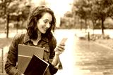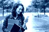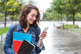 Portrait of a young student with backpack going to school and using her smartphone - Technology and education concept