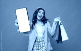 Happy Asian woman holding colorful shopping bags and showing blank smartphone screen for online shopping, mobile payment, or e-commerce app mockup on pink background