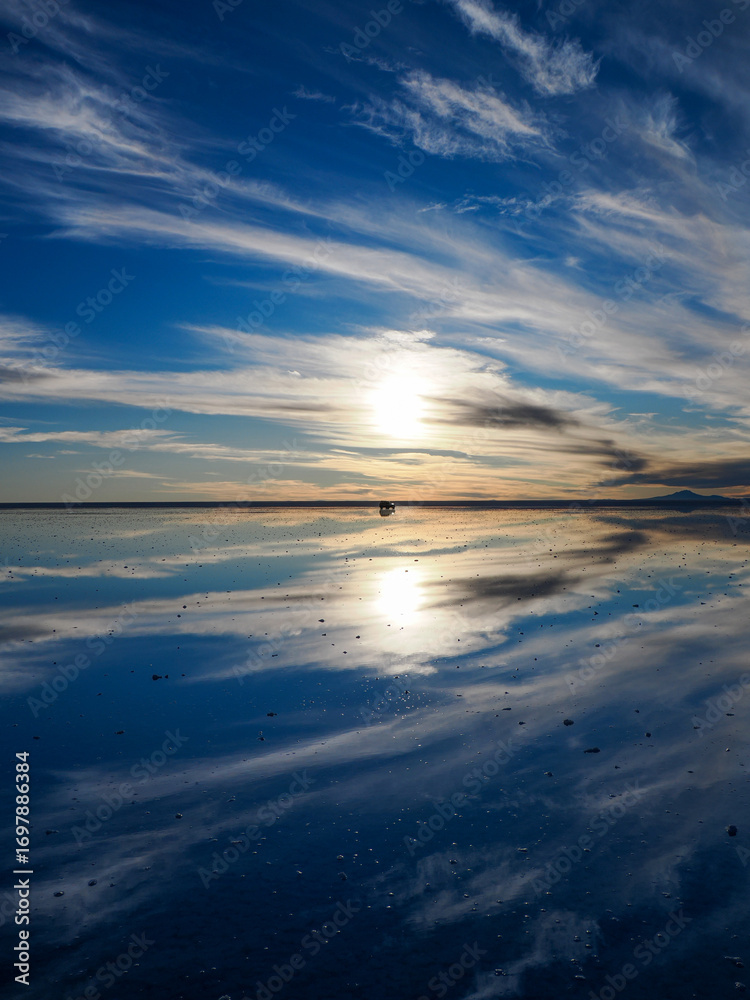 Vertical landscape photography of Salar de Uyuni with mirror effect., sunset.