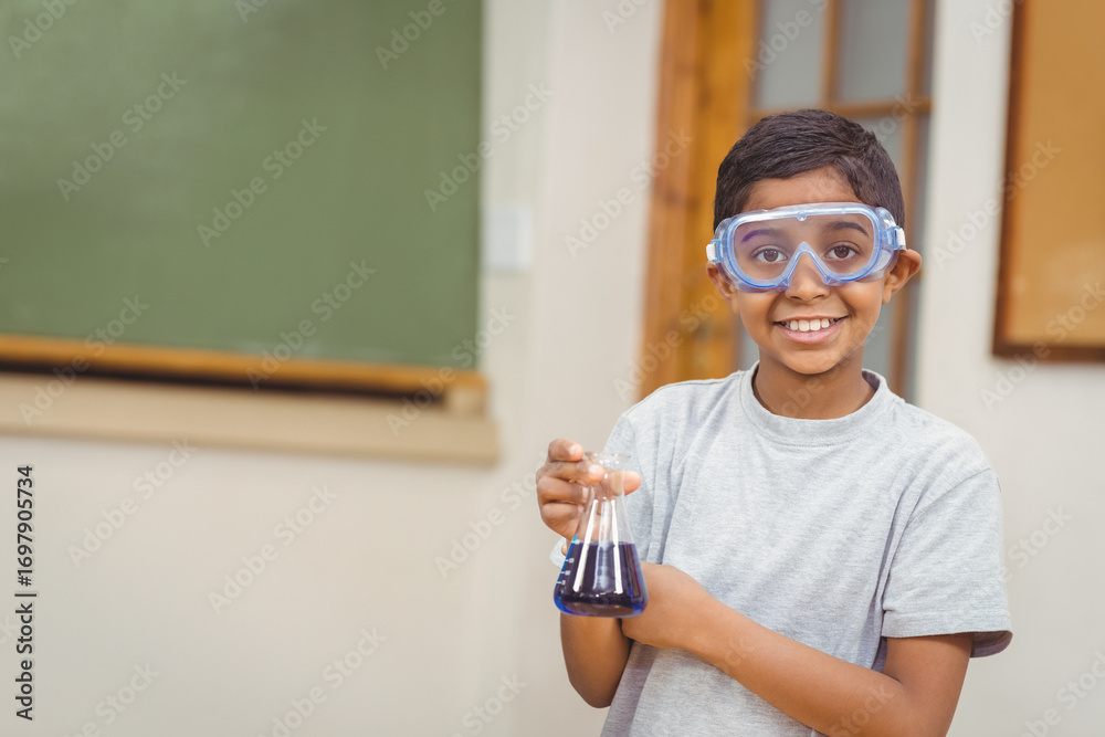 Conical flask holding dark blue liquid is resting on classroom desk, near green chalkboard