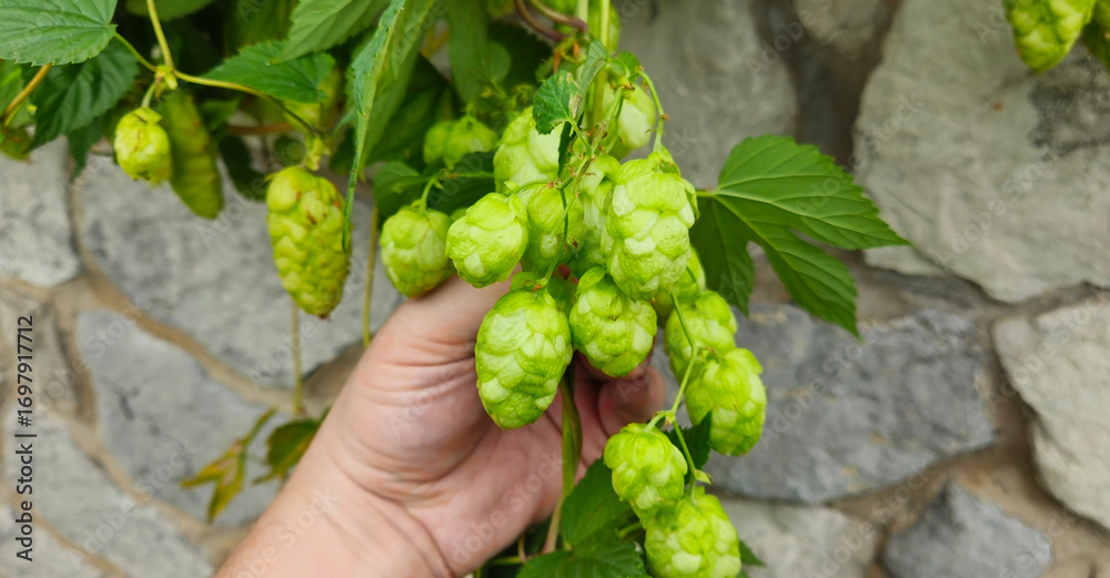 Human hand holding hop harvesting agriculture green leaves yellow hop flower growing farm brewery company noble